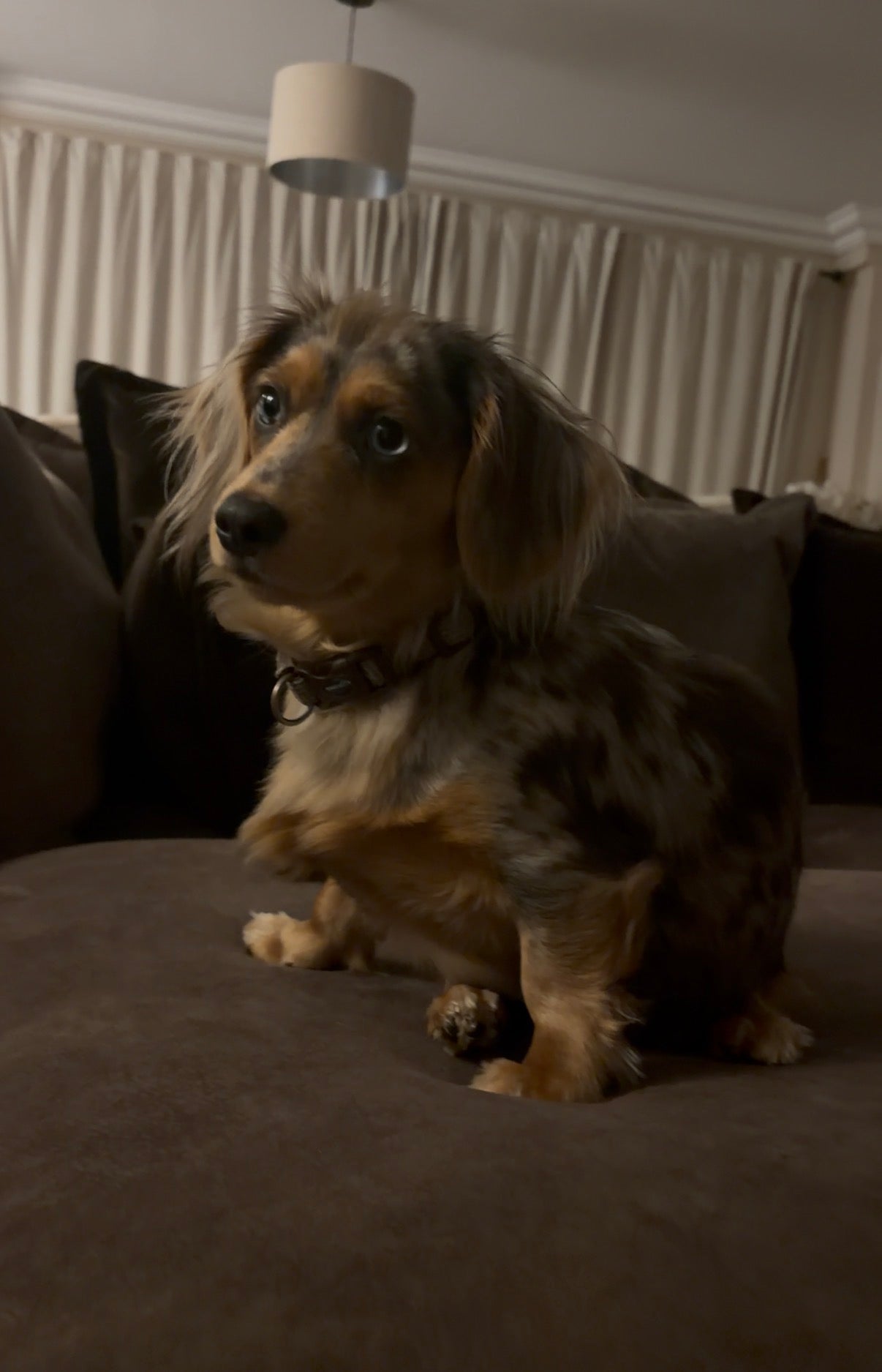 Oreo, our blue-eyed dapple miniature dachshund, attracts attention wherever she goes. With her striking eyes and confident personality, she rarely goes unnoticed.